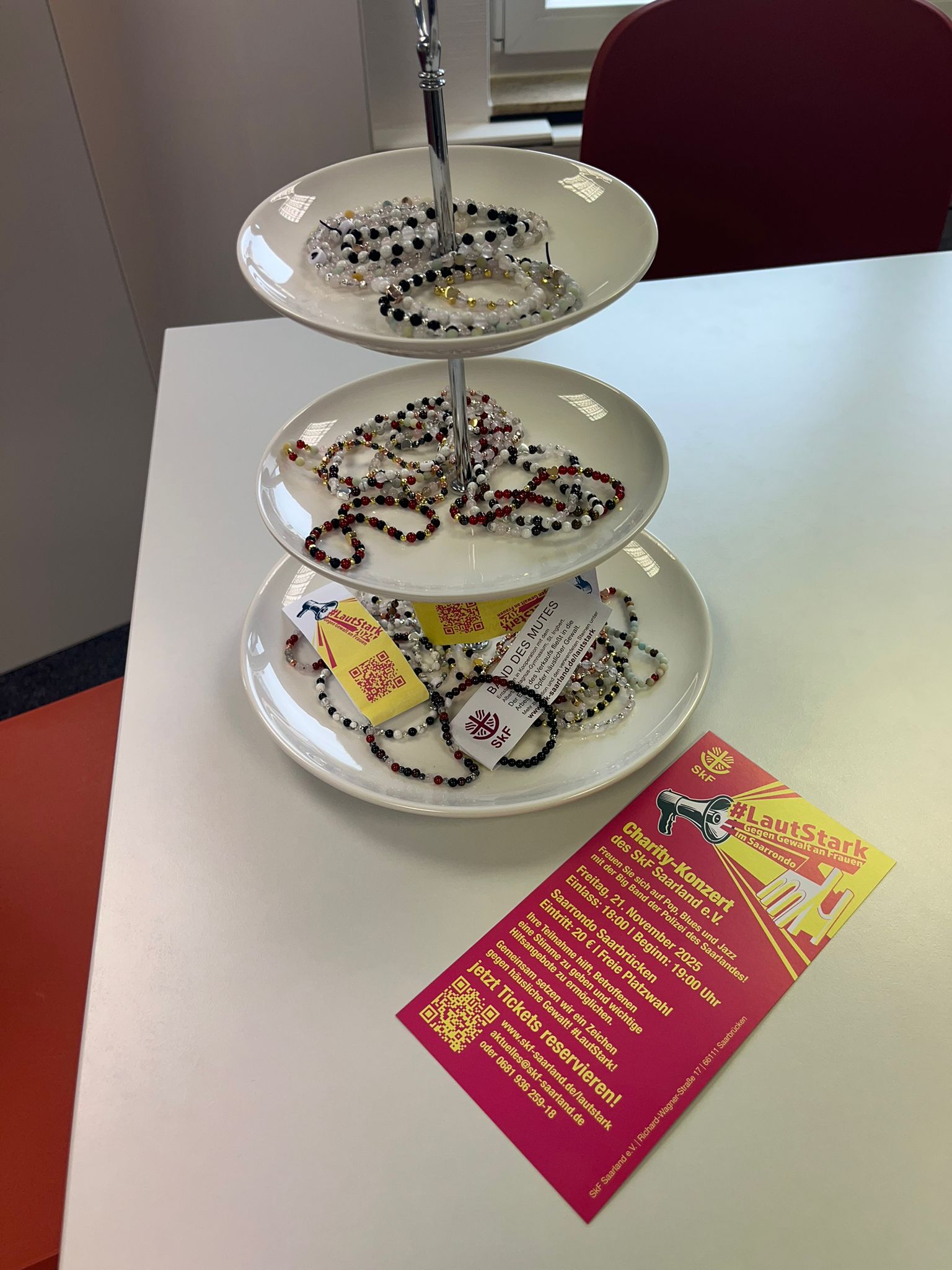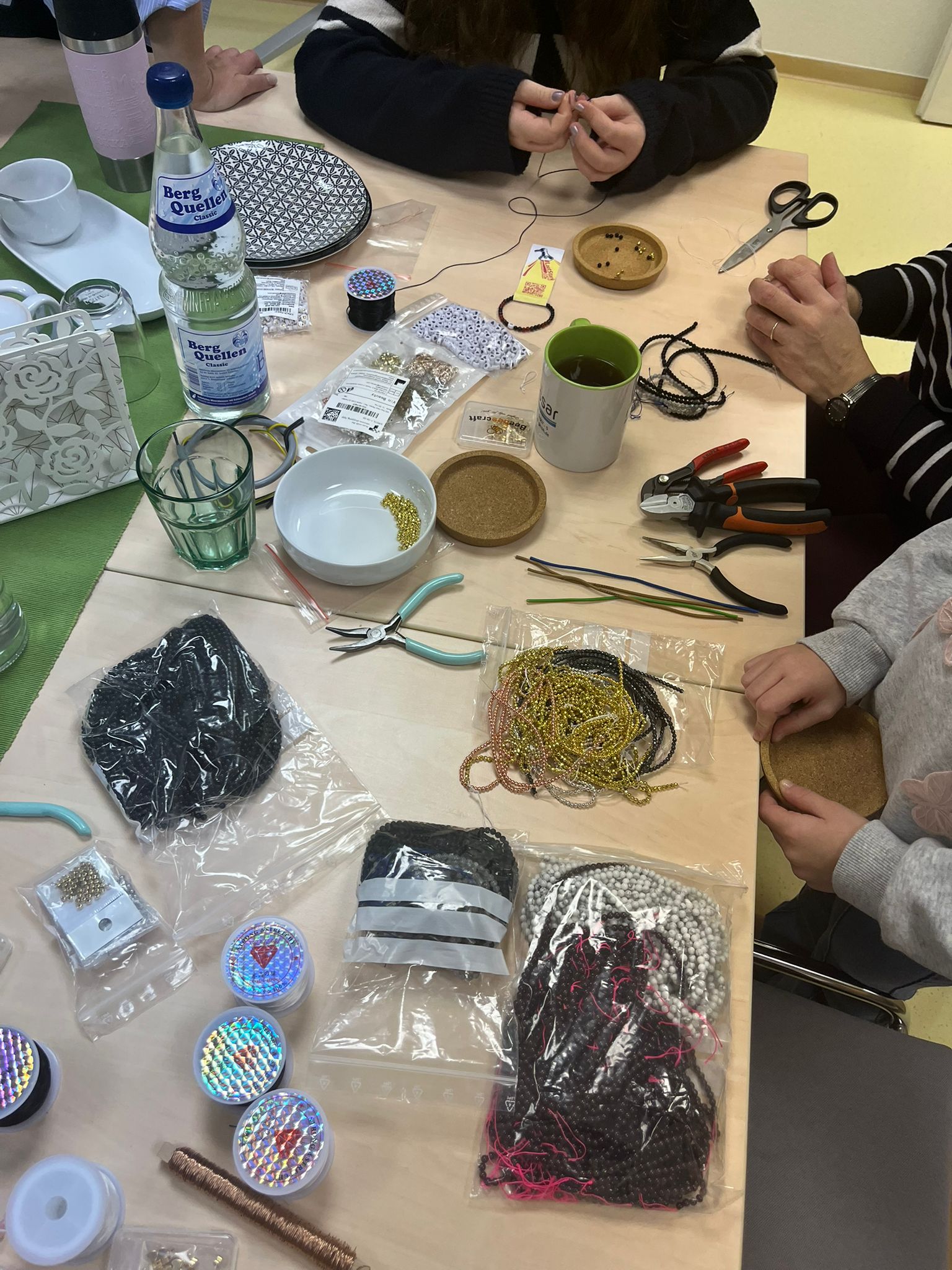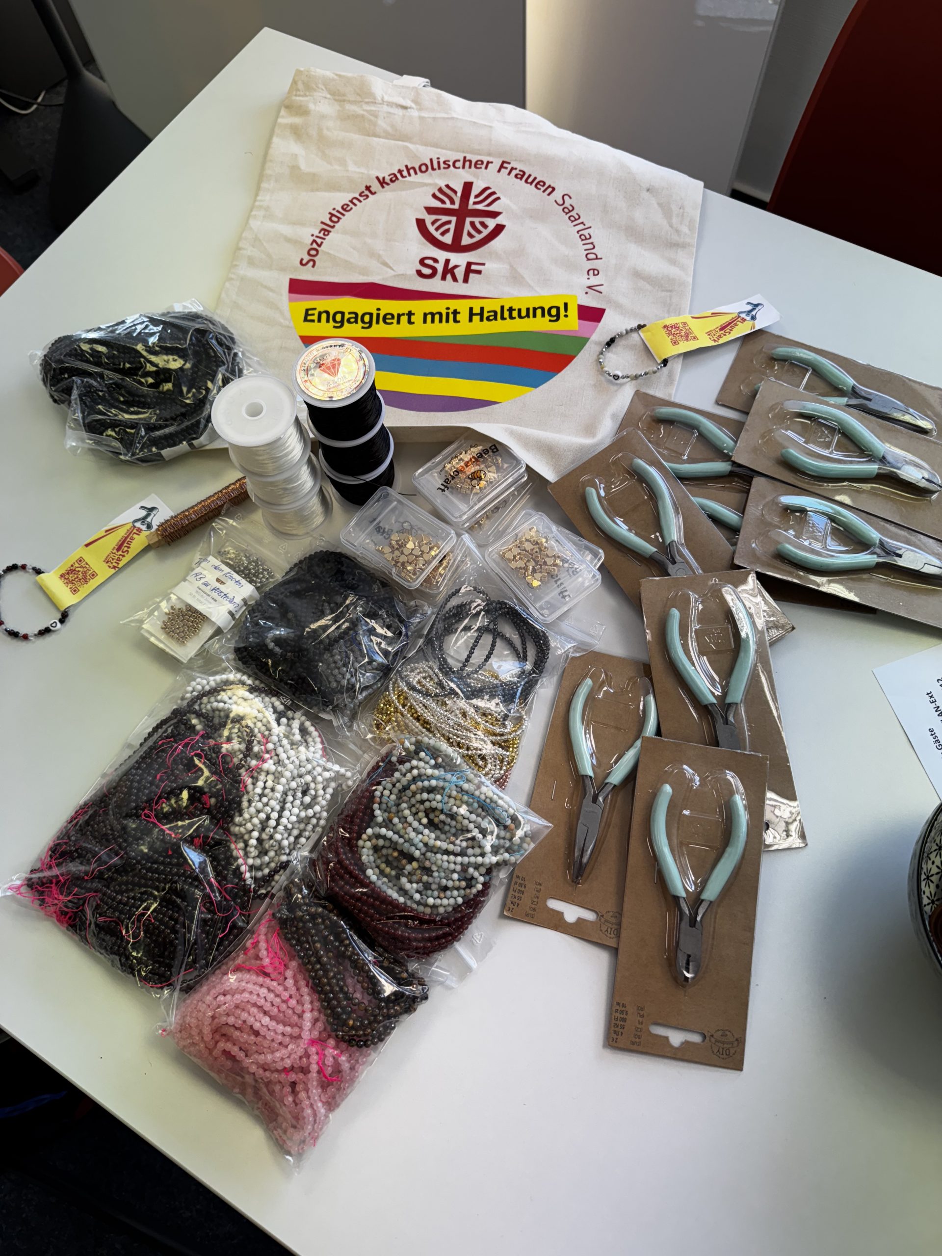 Das Material ist angekommen und schon jetzt haben sich die ersten fleißigen Hände an die Arbeit gemacht: Mitarbeiterinnen des SkF Saarland e.V., unterstützt von Kindern und Jugendlichen, sortieren, fädeln und gestalten die neuen Schmuckstücke aus echten Edel- und Halbedelsteinen.